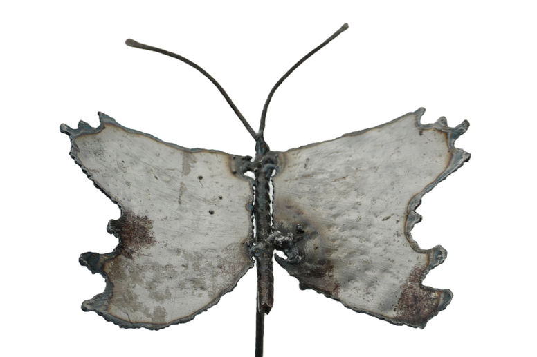 En dekorativ sommerfugl i metall plassert på en svartlakkert trekloss. Den svarte klossen fremhever de elegante detaljene i sommerfuglen og gir skulpturen et røft uttrykk. Hver skulptur har små variasjoner som gjør den unik. Perfekt for hyllen, kommoden eller vinduskarmen i både moderne og klassisk rom, i hjemmet, hytte eller på arbeidspalssen.